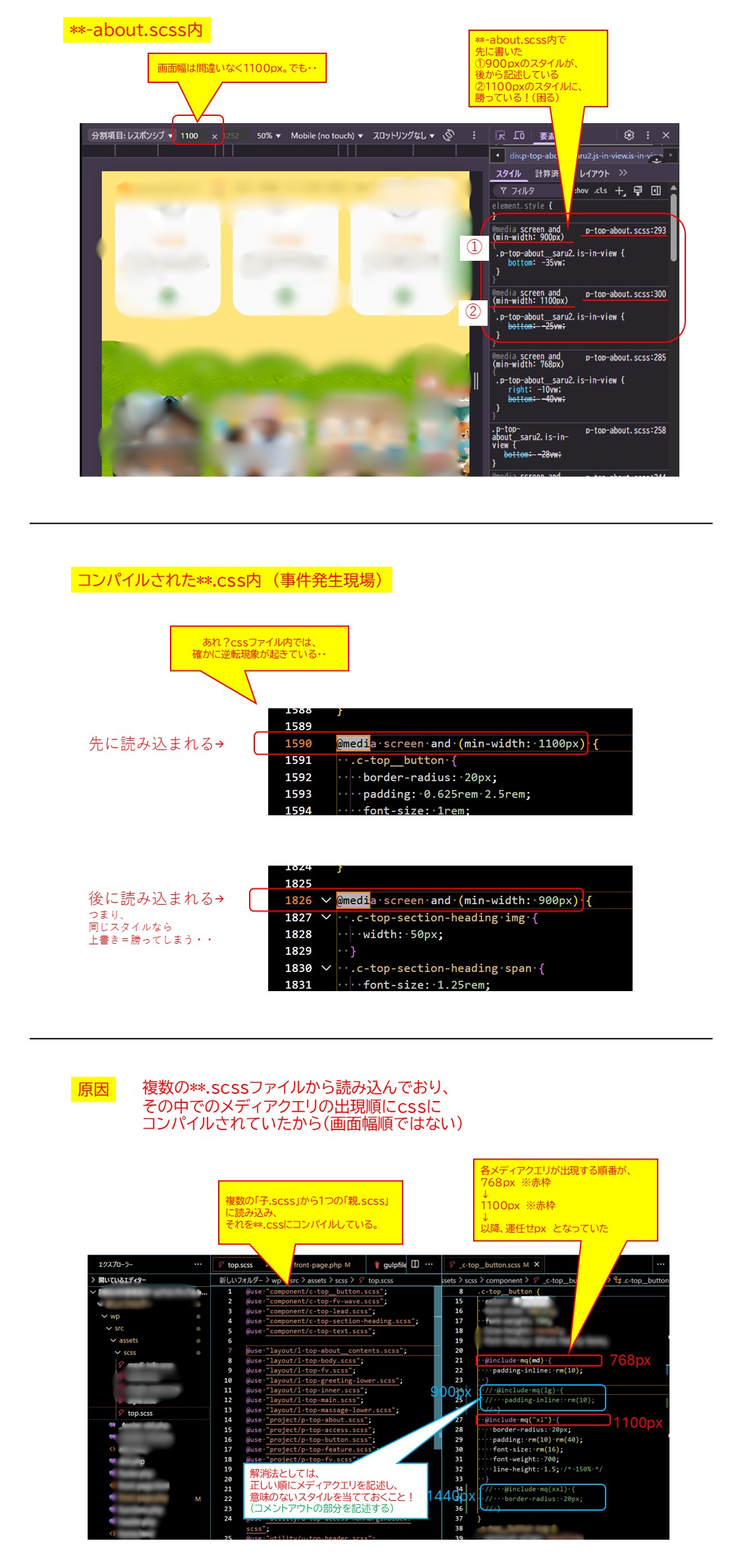 きちんと指定しているメディアクエリが適用されず、 他の画面幅のスタイルが当たってしまう現象です。